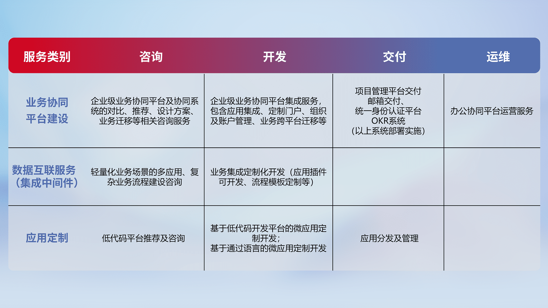 针对钉钉、、企微、、IDaas等平台级产品提供产品的规划、、、方案、、、交付、、定制化开发等服务,,实现如统一协同办公、、、、智能客户服务、、、、混合会议管理、、、、智能数据查询、、、等业务场景,,实现数字化转型。。。